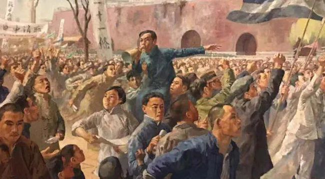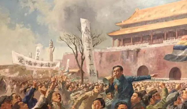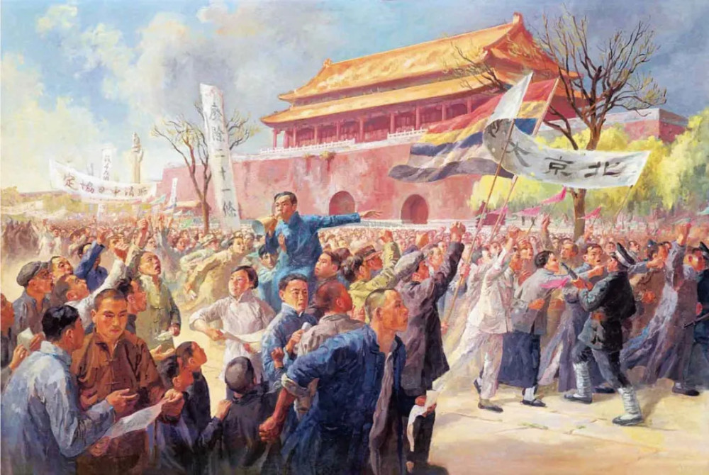 这幅作品的主题是中国近代史上具有划时代意义的大事件——五四运动。1919年,“巴黎和会”上中国代表提出的废除外国在华特权,取消不平等条约的正当要求被西方列强蛮横拒绝。消息传来,以青年学生为先导、社会民众广泛参与并席卷全国的五四爱国运动如火山一般爆发。