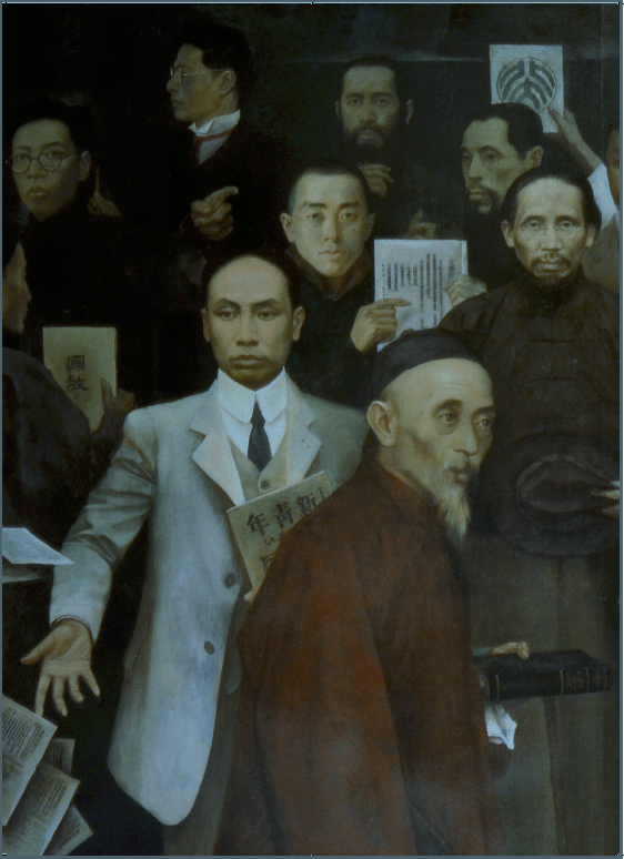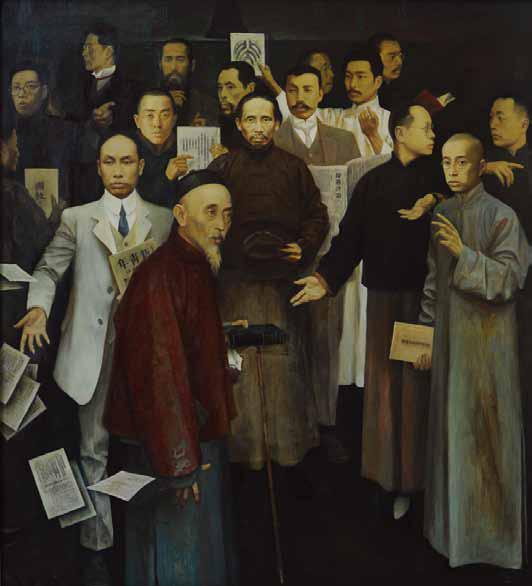 这是一副描绘“五四”时期知识分子的群像,反映的是蔡元培先生任北京大学校长期间,延揽学界名流同登教席、同台竞逐的情景。