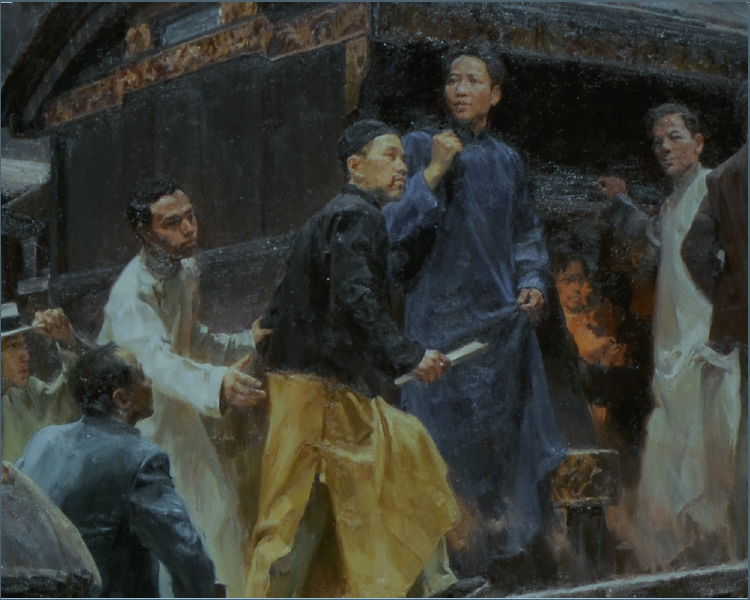画家匠心独运地选取了中共一大代表们正在登船的瞬间。一袭蓝布长衫的毛泽东在画面的中央,他伫立船头向着来处回首眺望,显得格外机警沉着,但又英姿勃发,充满自信。紧随其后疾步登舟的董必武,身着马褂、手持折扇,以细腻的笔触交代了这位代表的知识分子身份。画作中其他代表有的从容淡定,有的意气风发——亦刻画得惟妙惟肖。