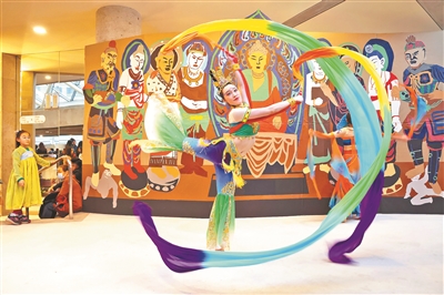 近日,展示敦煌元素与中西结合的创新表现力的“远古回响——穿越敦煌暨艺术创新展”在加拿大多伦多揭幕,让世界感受中华优秀传统文化的悠久厚重与丰富多彩。图为舞蹈演员以舞姿再现敦煌飞天形象。图片来源:视觉中国